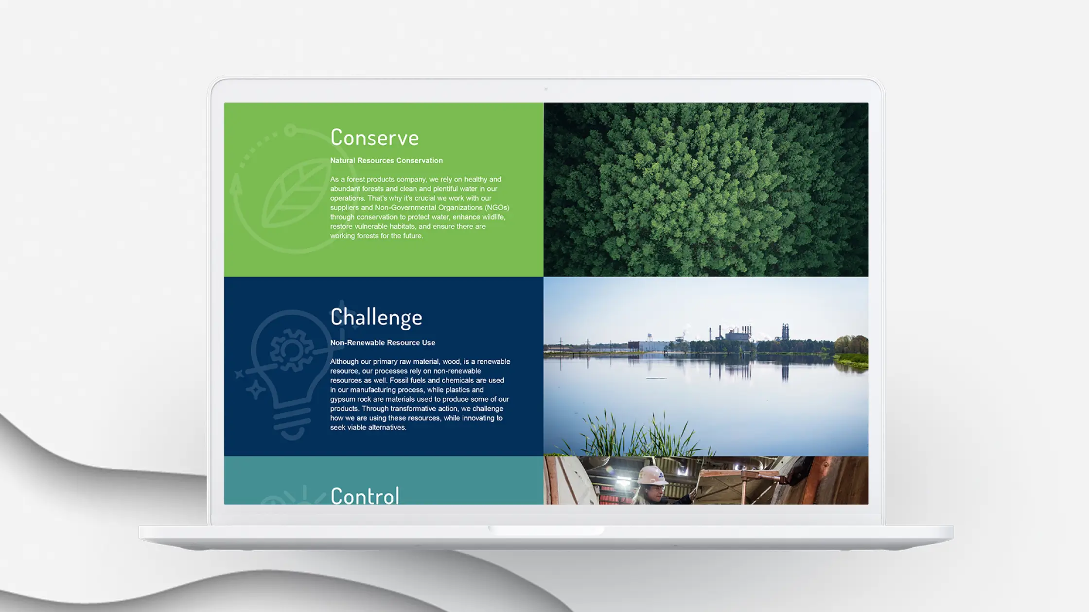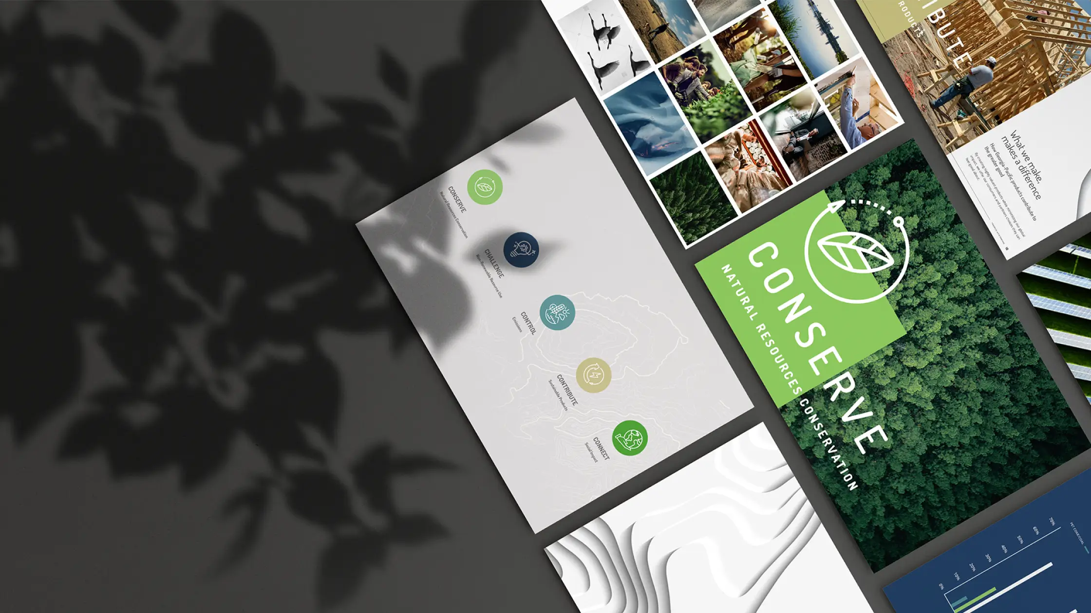 Words matter. They’re integral to our understanding, and the breadth and depth of GP’s sustainability efforts warranted a more robust vocabulary. After a deep Discovery process, we built a compelling messaging framework around GP’s priorities, the Principles of Progress, to better organize and accurately describe each area of impact. A robust visual system helped to easily identify the various initiatives by utilizing a repeatable framework that could be adapted for the web, social, annual reports, and more. From data visualization and iconography to infographics and topographical patterns, consumers and stakeholders alike could match the sophistication of the message with a bold, layered effect to the visual storytelling. Photography often featured GP employees, emphasizing their commitment to sustainability and the people who drive it.